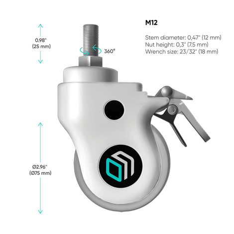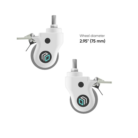 Multipurpose 2.95-inch size of the wheels with a 0.47” (M12) stem can be attached to any desk, cart or a mobile TV stand; these locking caster wheels can be a perfect replacement for standard wheels of TV carts by ONKRON, including models TS1551, TS1881, TS2771 and others (all mobile stands except for TS1351 and TS2551).