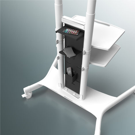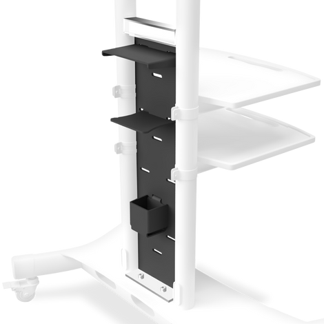 - This accessory pack consists of acrylic vertical panel that is installed on the base of the cart, plastic shelf for your devices, a mount for cable winding and a glass for accessories