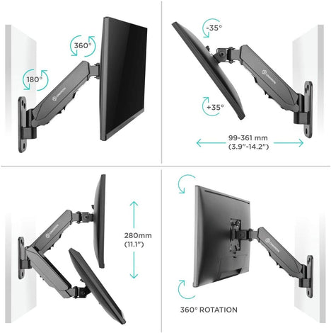 It is designed to be ergonomic to enhance your viewing and gaming experience. Built-in gas spring allows you to move your monitor or TV in any direction and at any height. Possible distance from the wall is 3.3” ~ 14.2 inches. Articulating arm G120 features tilting -35 ~ +35 degrees and swiveling 180 degrees, giving you freedom of choosing viewing angles.