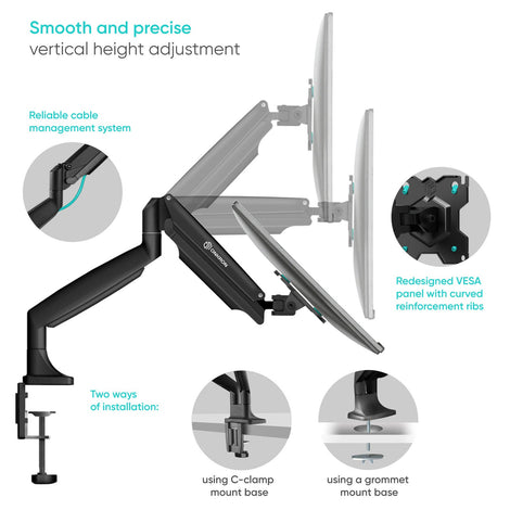 • Two ways of installation on the desk – C-Clamp or grommet; all hardware and guides are included