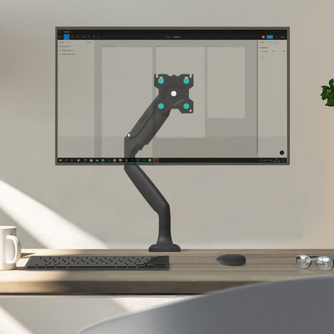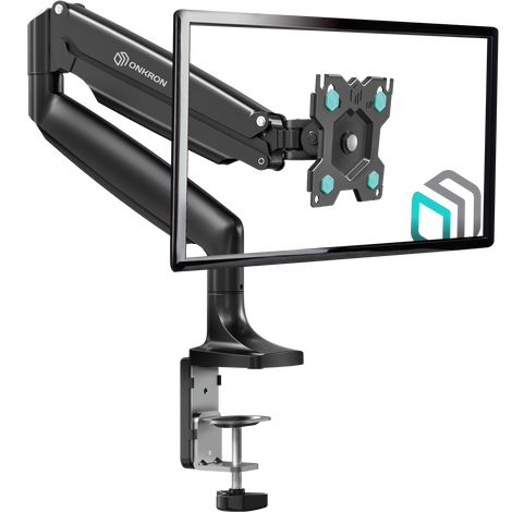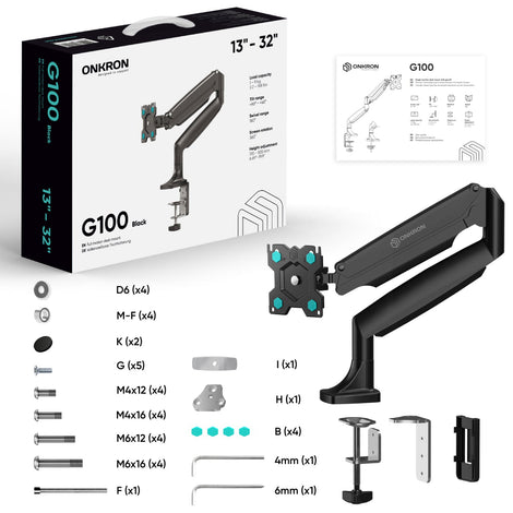 The ONKRON G100 is a gaslift-powered monitor arm for flat and curved computer screens weighing up to 19.8 lb. with diagonals from 13" to 32". The mounting bracket is VESA compatible (75 mm x 75 mm minimum to 100 mm x 100 mm maximum) with most flat or curved monitors: LCD, LED, OLED, QLED, HD, 4K.
