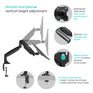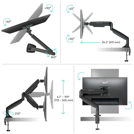 Supports an up-down tilt from +90° to-45°, left-right swivel 180° and 360° rotation. Rotate it into landscape or portrait view, and fix it in any position on your eye level. The improved design of the monitor desk mount allows it to extend up to 24.2" in length and rise to 19.8" in height.