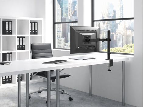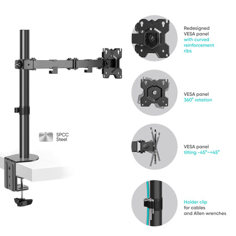 The single monitor stand folds compactly, placing the monitor as close to the wall as possible. You can extend your monitor screen up to 17.7 inches from the mount base; lower and raise it to 18.3 inches.