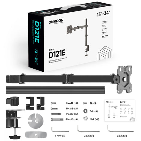 The ONKRON D121E is an desktop monitor mount made of SPCC steel for flat and curved computer screens weighing up to 17.6 lb. with diagonals from 13" to 34". The mounting bracket is VESA compatible (75 mm x 75 mm minimum to 100 mm x 100 mm maximum) with most flat or curved monitors: LCD, LED, OLED, QLED, HD, 4K.