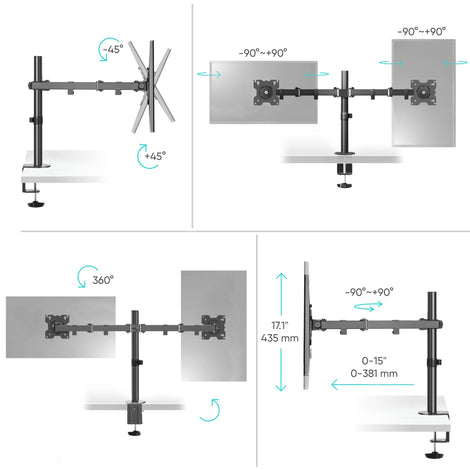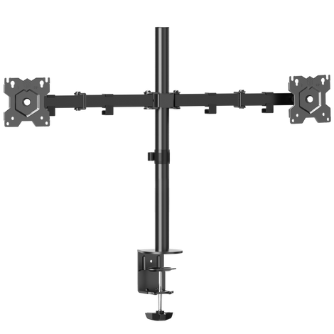 The ONKRON D221E is a dual desktop monitor mount made of SPCC steel for flat and curved computer screens weighing up to 17.6 lb. with diagonals from 13" to 32". The mounting bracket is VESA compatible (75 mm x 75 mm minimum to 100 mm x 100 mm maximum) with most flat or curved monitors: LCD, LED, OLED, QLED, HD, 4K.