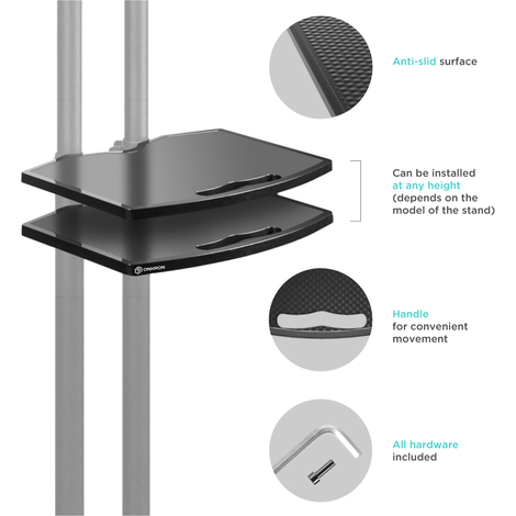 Comes with 2 shelves for your accessories - one under the screen with a load capacity of up to 10 lbs for audio video equipment, receivers, gaming accessories or laptops and a smaller one on top, also with a 10 lbs weight capacity, often used for webcams.