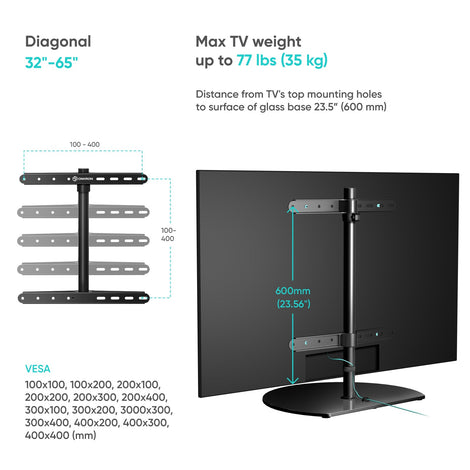 ✔️UNIVERSAL DESIGN: the tabletop TV stand fits most 32-65 Inch LCD, LED flat or curved screens with VESA mounting holes from 100x100mm (min) to 400x400mm (max). The TV position is freely adjustable over the entire height of the pole (24.6") using a screw on the back of the column.