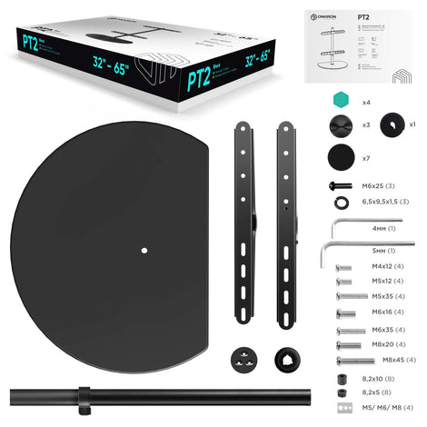 PT2 stand comes with 7 different types of bolts for TV mounting and is compatible with 98% of televisions currently offered on the market. Elastic inserts will protect the back of the TV from scratches. Assembly is fast and easy in just three steps!