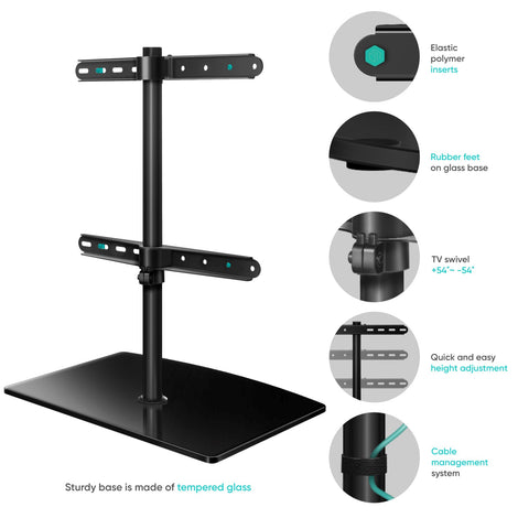 Looks stylish and matches any interior. Wide base provides stability for TVs with max weight up to 88 lbs. High quality steel construction ensures safety and durability in use.