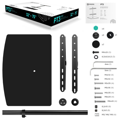 ONKRON PT3 is an interior table top TV stand made of SPCC steel and tempered glass for TVs up to 88 lb with diagonals from 32" to 75".