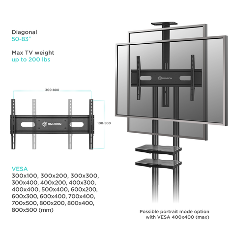 Fits practically all modern screens - LCD, LED, OLED, Ultra HD, plasma, curved and flat panel screens with VESA mounting standards: 200x200, 200x300, 300x200, 300x300, 300x400, 400x200, 400x300, 400x400, 600x400 up to 800x500 mm