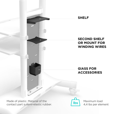 Comes with 2 shelves for your accessories - one under the monitor with load capacity of up to 10 lbs for audio video equipment, receivers, gaming accessories or laptop, and a smaller one on top, with additional 10 lbs capacity weight, often used for webcam.