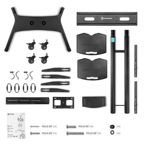 For bigger and heavier screens pick sturdy, all steel mounting frame on wheels for easy mobility and convenience - universal TV cart ONKRON TS1881. Height adjustable rolling TV stand ONKRON TS1881. with double shelving designed for big screens and fits flat panel or curved displays, LCD, LED, OLED, QLED, HD, 4K televisions, gaming monitors, TV sets, with bigger diagonals from 50” to 83 inches weighing up to200 lbs.