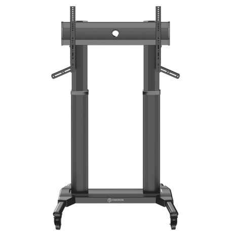 The ONKRON TS2771S is a universal TV cart on lockable wheels ideal for larger and heavier screens. This heavy duty design consists of aluminum components, which improves load capacity. The mounting bracket is VESA compatible (200 mm x 200 mm minimum to 700 mm x 400 mm maximum) with most large, flat or curved TVs/gaming monitors: LCD, LED, OLED, QLED, HD, 4K; with diagonal measurements from 40" - 82 inches weighing up to 122 lb. This stand is equipped with a soundbar mount.