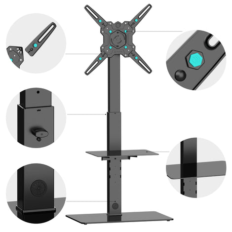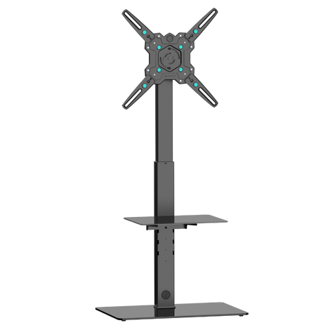 Comes with one AV shelf for your accessories with a load capacity of up to 10 lb. for audio visual equipment, receivers, gaming accessories or a laptop. The shelf is height adjustable and is made of tempered glass, as is the sturdy base.