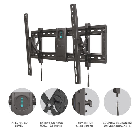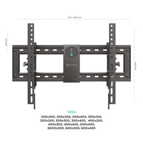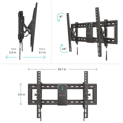 ONKRON UM7 Black is a universal TV mount wall bracket for 50"-85" TVs weighing up to 150 lbs. Equipped with a unique extending/tilting mechanism, it allows the TV to be extended from the wall for up to 5 inches and tilt up to 8° in upwards as well as downwards.
