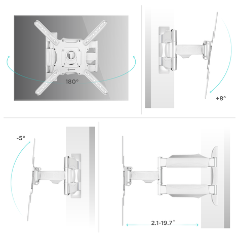M4 is fully adjustable, you can tilt your TV -5 deg ~ +8 deg, swivel 180 deg and set horizontal screen level from -4 deg to +4 deg. All these adjustments provide perfect viewing experience all the time.