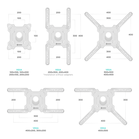 Compatible with VESA mounting patterns from 100 x 100 mm (min) to 400 x 400 mm (max) with wide variety in between.