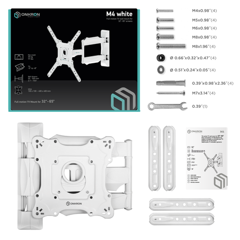 Single armed ONKRON TV wall mount M4 in white is universal and was tested to support flat and curved screens of practically all brands of LED, LCD, OLED, HDTV, smart TV monitors and displays on today’s market and is best fitted for screens with max load capacity of up to 77 lbs. Foldable articulating arm, steel construction with high – quality powder coating, extendable up to 20 inches and easily retractable all the way back to the wall (2 inches slim profile). Cable management proven to be very popular design feature - removable plastic plates cover cables and wires for contemporary streamlined look. Comes with the instructions and all needed hardware – including set of M8*50 bolts, suitable for Samsung TVs and usually not found in standard mounting kits. ONKRON M4 series mounts provide secure support for large screens with swivel, tilt and wide range of easy motions. Our white version of M4 mount is a true winner for a viewer who appreciates style, quality and value.