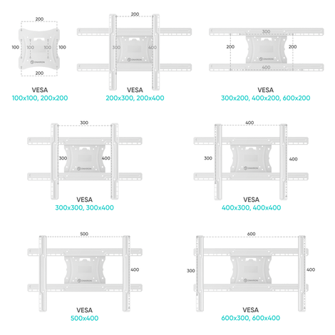 Supports televisions with diagonal from 39” up to 60 inches. Fits practically all modern screens - LCD, LED, OLED, Ultra HD, plasma, curved and flat panel screens and televisions. Compatible with VESA mounting patterns from 100 x 100 mm (min) to 600 x 400 mm (max) with wide variety in between.