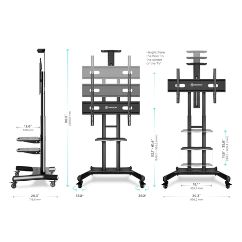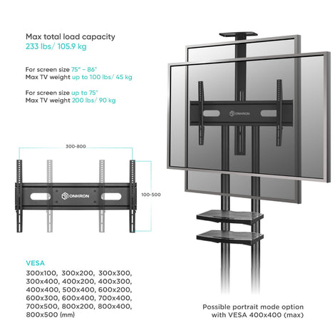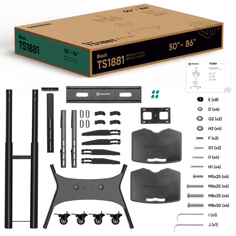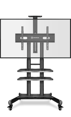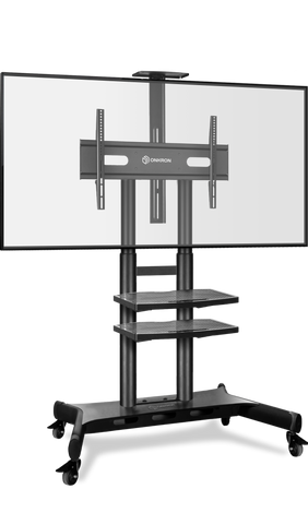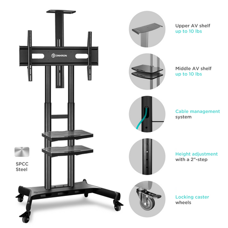 The ONKRON TS1881 is a universal TV cart on lockable wheels ideal for larger and heavier screens. This heavy duty design consists of SPCC (cold rolled carbon steel) components, which improves load capacity. The mounting bracket is VESA compatible (300 mm x 100 mm minimum to 800 mm x 500 mm maximum) with most large, flat or curved TVs/gaming monitors: LCD, LED, OLED, QLED, HD, 4K; with diagonal measurements from 50" - 83 inches weighing up to 200 lb.